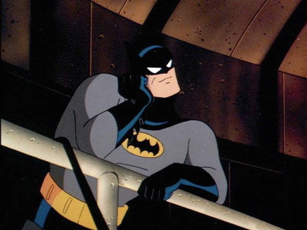 ![]() A highly uncharacteristic pose, from the close of "The Last Laugh." Seems closer to The Spirit than to the Batman we're used to seeing. |